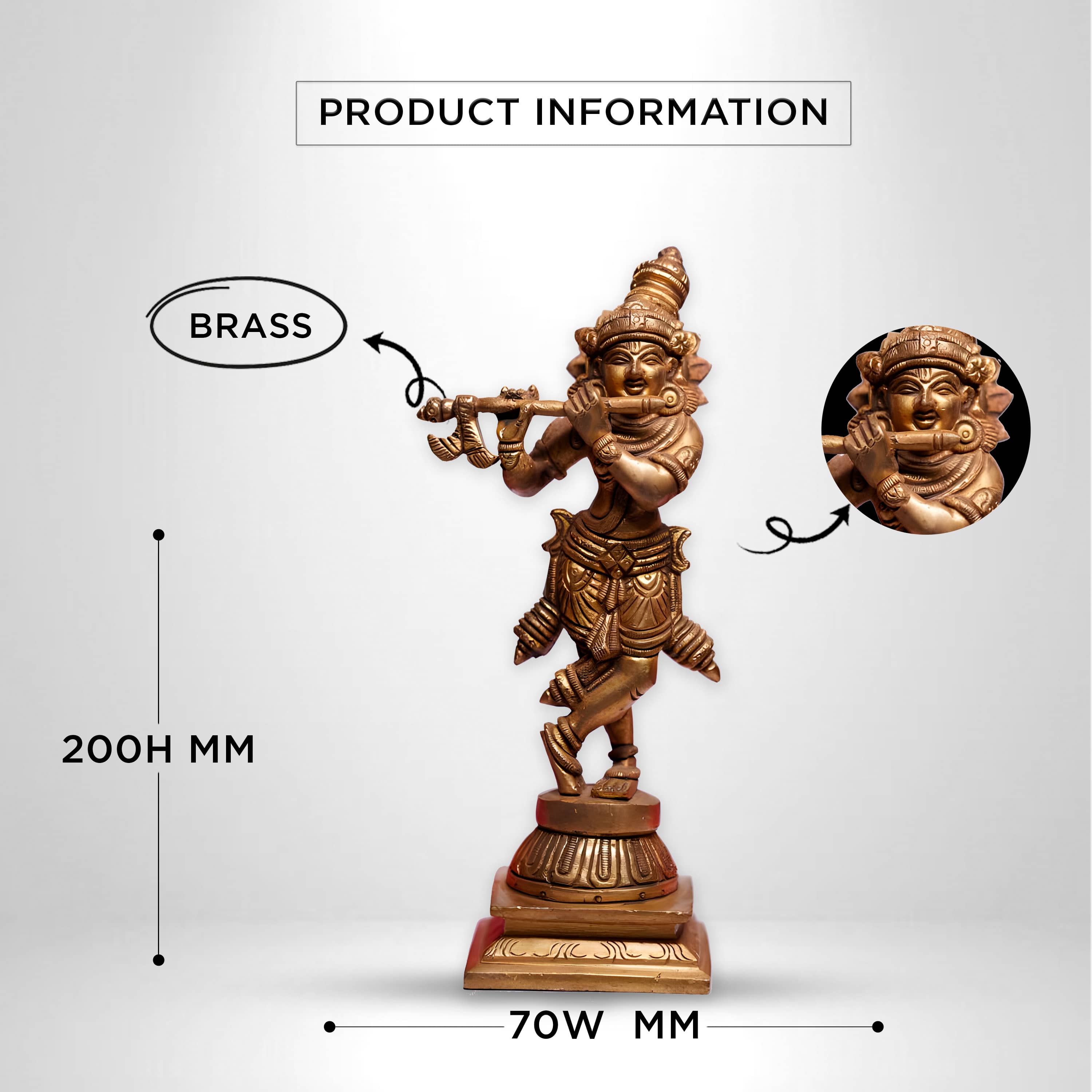 Handcrafted 200mm tall brass idol of Shree Krishna with flute – perfect for temples, festive décor, and devotional gifting.